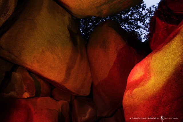 Forteresse celte imprenable dès le 1er siècle avant JC, avant de devenir, au XIIe siècle, le centre militaire des seigneurs bretons, Huelgoat abrite en son sein 600 hectares d’une forêt baignée de mystères et de mythes auxquels Yann Kersalé rend un hommage éblouissant. Sur quelques centaines de mètres, perchés au-dessus de la rivière serpentant autour des amas de roches offrant au Chaos du Diable une dimension cyclopéenne, Yann Kersalé a installé un brasero gorgé de bois flottants préalablement brûlés. Ainsi enflammé, le brasero devient lanterne et transforme la rivière et son environnement en un bras rougeoyant. Poétique, inquiétant, incandescent, le chaos du diable n’aura probablement jamais aussi bien porté son nom.